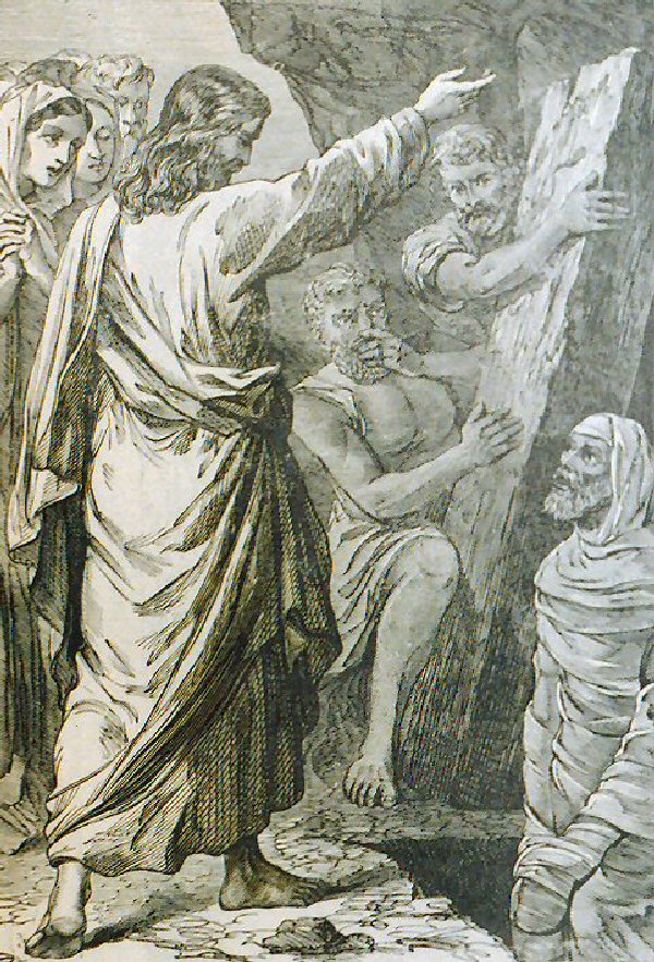 So Jesus, perturbed again, came to the tomb.  It was cave, and a stone lay across it.  Jesus said, "Take away the stone."  Martha, the dead man's sister, said to him, "Lord, by now there will be a stench; he has been dead for four days."  Jesus said to her, "Did I not tell you that if you believe you will see the glory of God?"  So they took away the stone.  And Jesus raised his eyes and said, "Father, I thank you for hearing me.  I know that you always hear me; but because of the crowd here I have said this, that they many believe that you sent me."  And when he had said this, He cried out in a loud voice, "Lazarus, come out?"  The dead man came out, tied hand and foot with burial bands, and his face was wrapped in a cloth.  So Jesus said to the, "Untie him and let him go."