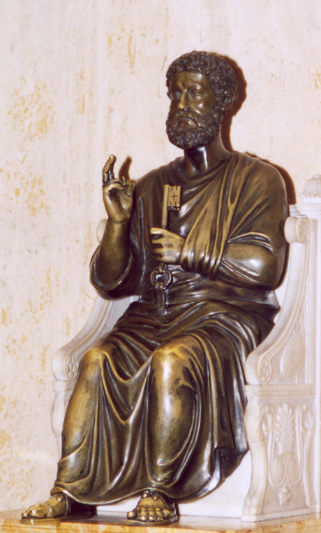 And so, when Jesus takes the Twelve Apostles into Caesarea Philippi, He is taking them into Gentile territory, away from the "buzz." Very few of the Jews would follow them into Gentile territory because doing so would make the Jews ritually impure and they would have to perform all kinds of ceremonial washings for having stepped foot onto Gentile soil. So, Jesus takes the Twelve away from any influence of prejudice or hype and He asks them two simple questions. First, He asks them about public opinion - "Who do the people say the Son of Man is?" We have a Scriptural opinion poll - 33 percent say that Christ is John the Baptist; 33 percent say that He is Jeremiah and so forth and so on. Then, Jesus asks them a second question, "Who do you say that I am?" Simon bar Jonah, which means Simon son of Jonah, takes the lead. By God's grace, he gives the correct answer. Simon, whose name is now changed to Peter, meaning "rock," exclaims that Jesus is the Son of God, the Christ.