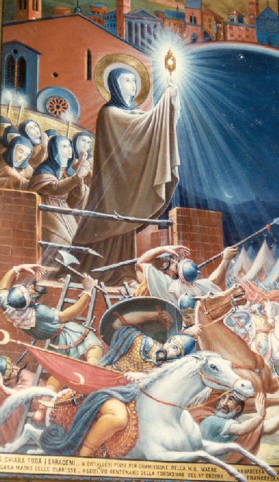 Saint Clare, ardent lover of Jesus really present in the Most Blessed Sacrament, lead all people to Jesus. Obtain faith for the unbeliever, hope for the discouraged, strength for the weak, courage for the fearful, and love for Jesus for all in need. Gather our wounded Church, our suffering world, and all people into your loving heart and lift us all up to Jesus with your absolute confidence in His merciful love.