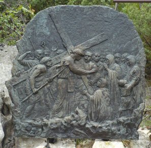 And it is the Son of God who is passing by, a madman . . . madly in Love! A woman, Veronica by name, makes her way through the crowd, with a white linen cloth folded in her hands, and with this she reverently wipes the face of Jesus. Our Lord leaves the impression of his Holy Face on the three parts of that veil.
