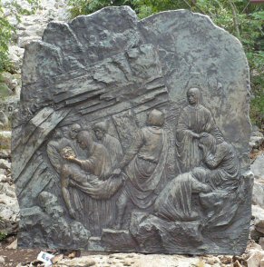 Jesus is laid there. Then Joseph, rolling a great stone, closes the