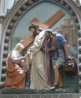 And it is the Son of God who is passing by, a madman . . . madly in Love! A woman, Veronica by name, makes her way through the crowd, with a white linen cloth folded in her hands, and with this she reverently wipes the face of Jesus. Our Lord leaves the impression of his Holy Face on the three parts of that veil.