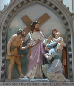 But Our Lord wishes to channel their weeping towards a more supernatural motive, and he invites them to weep for sins, which are the cause of the Passion and which will draw down the rigor of divine justice: Daughters of Jerusalem, weep not for me, but weep for yourselves and for your children . . . For if they do these things to the green wood, what shall be done to the dry? (Luke 23:28,31).