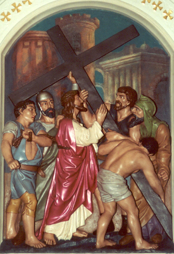 The cross is laid on Simon of Cyrene.
