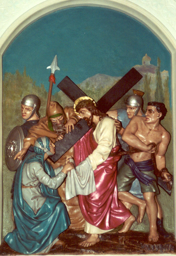Consider how this woman tried to lessen the sufferings of Jesus, and how he rewarded her by leaving the print of His sacred face on the towel she had in her hands. |