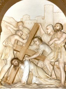 Our Lord falls for the third time, on the slope leading up to Calvary, with only forty or fifty paces between him and the summit. Jesus can no longer stay on his feet: his strength has failed him, and he lies on the ground in utter exhaustion. He offered himself up because it was his will; abused and ill-treated, he opened not his mouth, as a sheep led to the slaughter, dumb as a lamb before its shearers (Is 53:7).