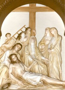 Mary stands by the Cross is engulfed in grief. And John is beside her. But it is getting late, and the Jews press for Our Lord to be removed from there. Having obtained from Pilate the permission required by Roman law for the burial of condemned prisoners, there comes to Calvary a councilor named Joseph, a good and upright man, a native of Arimathea. He has not consented to their counsel and their doings, but is himself one of those waiting for the kingdom of God (Luke 23:50-51). With him too comes Nicodemus, the same who earlier visited Jesus by night; he brings with him a mixture of myrrh and aloes, about a hundred pounds weight (John 19:39).