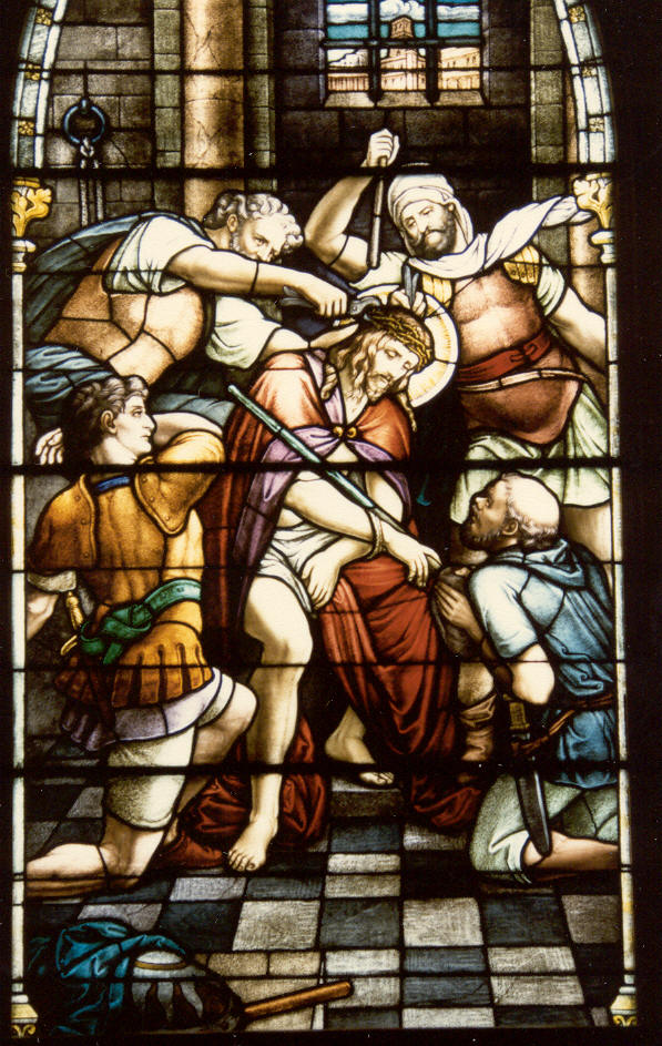 Pilate's next move was to take Jesus and have him scourged. The soldiers then wove a crown of thorns and fixed it on his head, throwing around his shoulders a cloak of royal purple. Repeatedly they came up to him and said, "All hail, King of the Jews!", slapping his face as they did so.