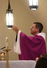 Purple priestly vestments symbolize penance and preparation.