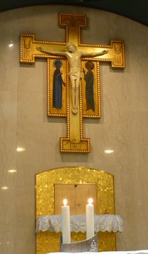 The Priest Approaches and Kisses the Altar: The altar is a symbol of Christ. In it are cut five crosses to recall the five wounds of Christ. The altar also represents the Church and has embedded in it the relics of her saints. The priest comes to the altar to celebrate the Sacrifice in the Church's name. Because of the glory surrounding the altar upon which the divine Sacrifice will be made, the kiss of the priest unites the Church to Christ, its Redeemer.